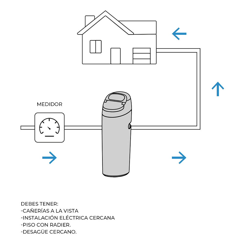 En la conexión de entrada de agua de tu casa, de esta manera, mantienes todo el agua que entra a tu casa sin sarro (calcio y magnesio). Para asegurar el óptimo funcionamiento del ablandador, se recomiendo instalar en un ambiente seco y protegido de los rayos del sol.