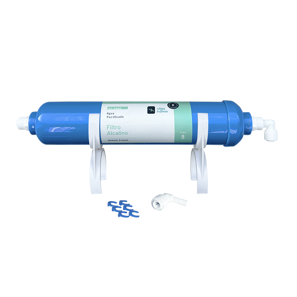 El kit filtro alcalino fue diseñado para aumentar el Ph del agua. Puede ser instalado como quinta etapa del equipo de osmosis inversa o como filtro de refrigerador. Al poseer carbón en su interior, este filtro también elimina el cloro.
